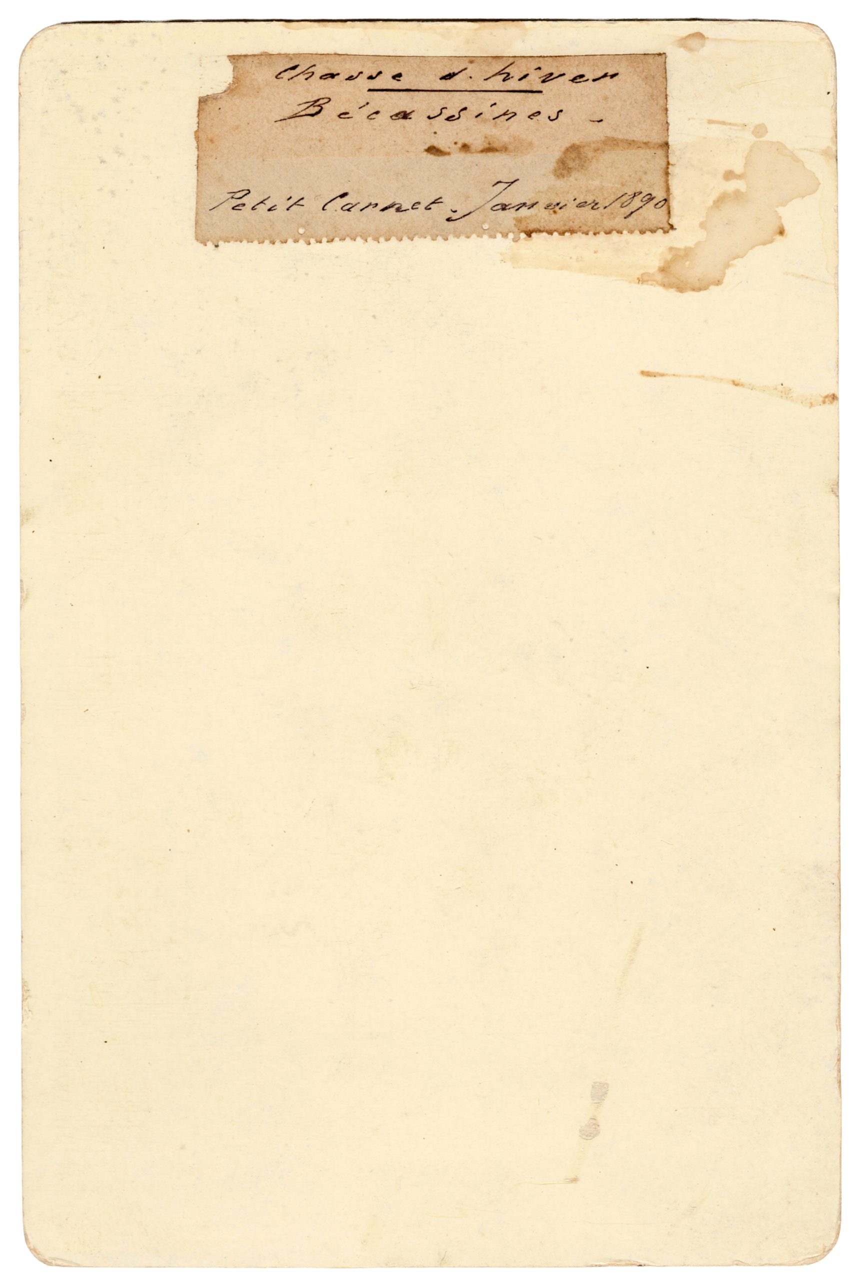 This field portrait captures a French sportsman engaged in winter snipe hunting, as confirmed by the handwritten note on the reverse reading Chasse d’hiver — Bécassines — Petit carnet Janvier 1890. The hunter stands in an open, grass-covered landscape, poised in the act of taking aim with a Lefaucheux pinfire shotgun. His stance is firm and deliberate, suggesting familiarity with the quick, low flight of snipe, a bird that requires precise timing rather than elaborate preparation.