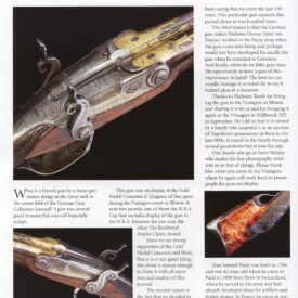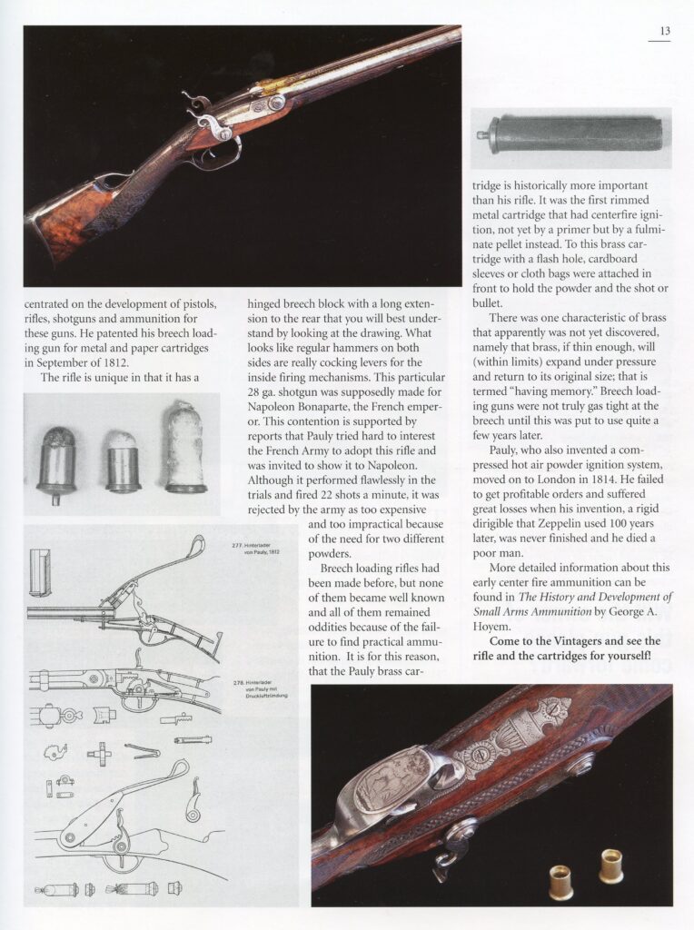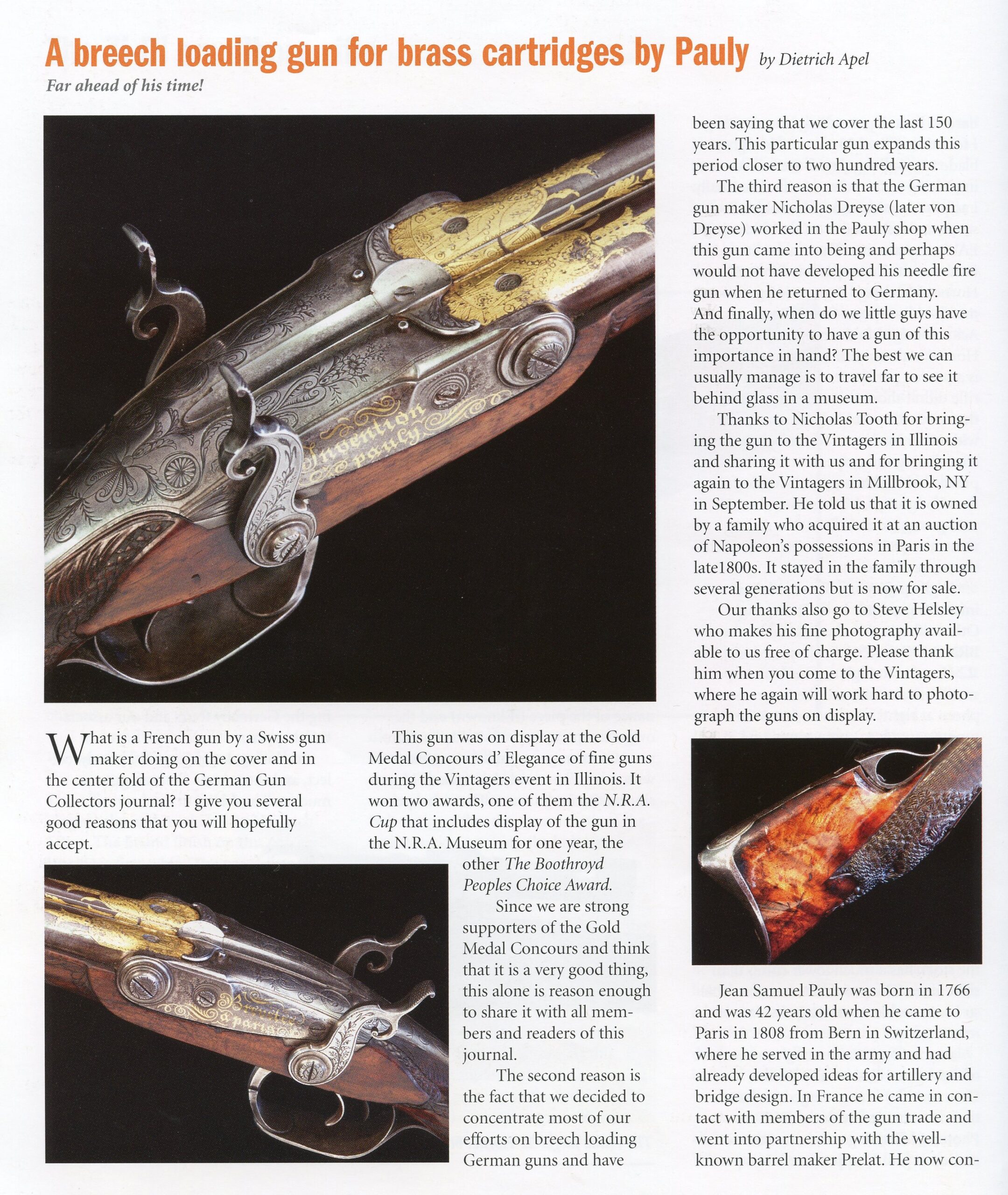 This article by Dietrich Apel delves into Jean Samuel Pauly's revolutionary design of a breech-loading gun for brass cartridges. It details the technical aspects of the gun, including its hinged breech block and use of a fulminate pellet for ignition. The article also highlights the gun's historical context, noting its exhibition at key events and its connection to Napoleon Bonaparte.